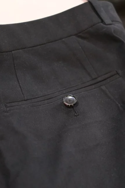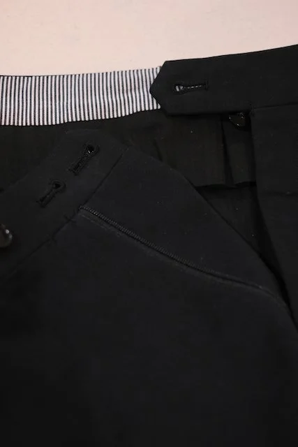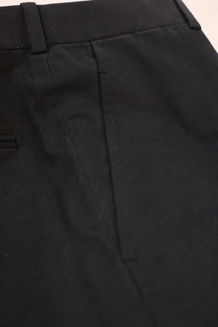 On these black cotton gabardines, the pocket detail is nearly invisible—just the way high-end tailoring should be.